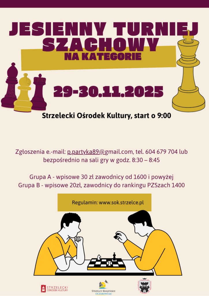 Strzeleckie Towarzystwo Miłośników Gry Królewskiej oraz Strzelecki Ośrodek Kultury zapraszają wszystkich miłośników szachów na dwudniowy turniej, który odbędzie się 29–30 listopada 2025 r. od godz. 9:00 w siedzibie ośrodka przy ul. Wojska Polskiego 7 w Strzelcach Krajeńskich.